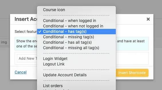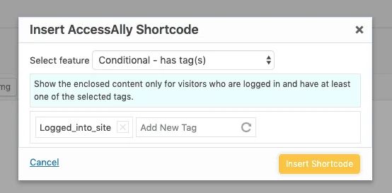 With your welcome message added to the page, you’ll use AccessAlly’s shortcode adder to select the Conditional – has tag(s) option.
