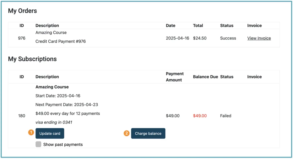 When a member with a failed payment, visits the My Orders & Subscriptions page – this is what they see. They can update their card & charge their outstanding balance if they’ve paid via Stripe.