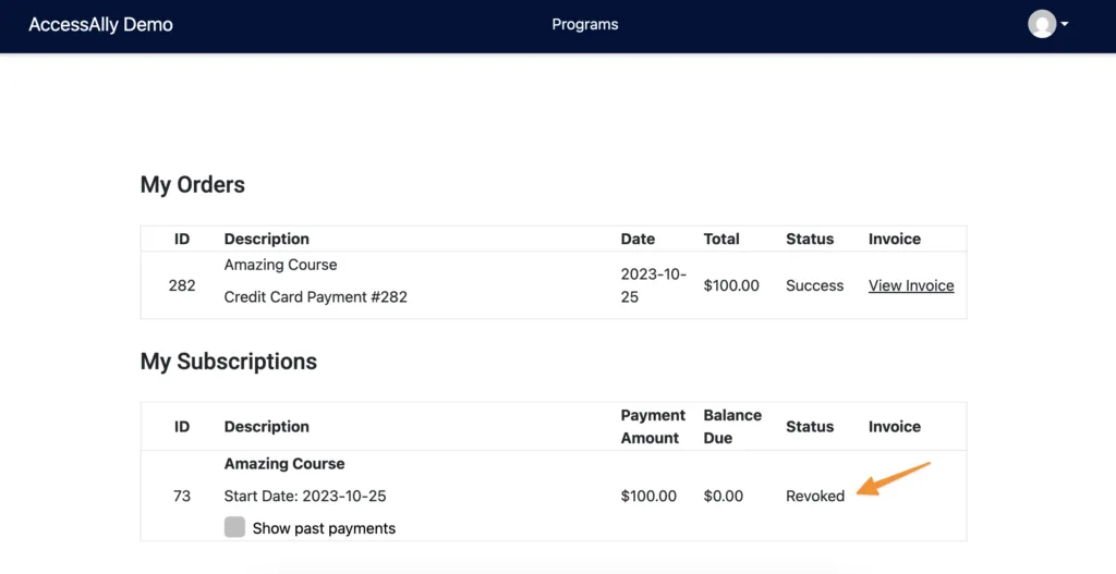 The My Orders & Subscriptions page will show as Revoked.
