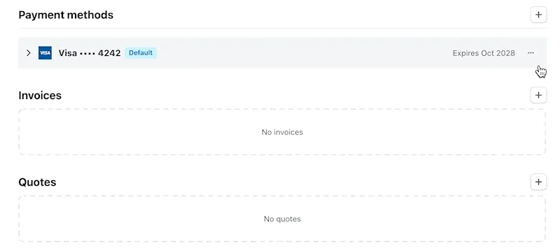Scroll to payment methods, click “… ” on right, click “Delete” and click “Remove” to delete the credit card.