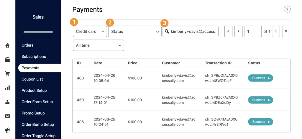 Confirm the email address of the customer that you’d like to delete the credit card for. Visit AccessAlly > Sales > Payments