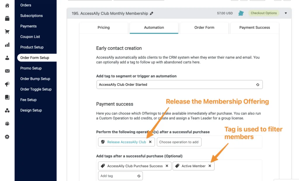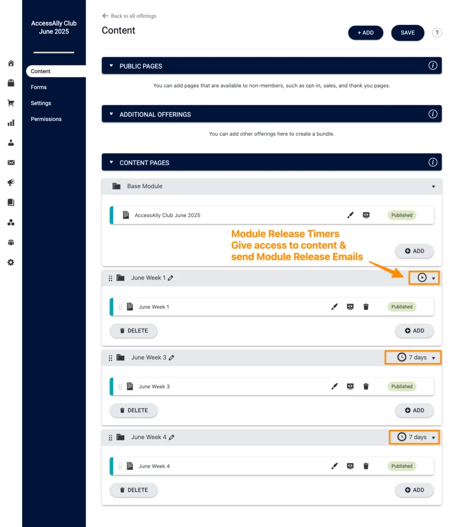 You’ll place everything you want delivered for the first monthly drop, in a new offering. The advantages to this are that you can drip release content, send AccessAlly Emails, and move your members into this offering – on the exact date you’d like!