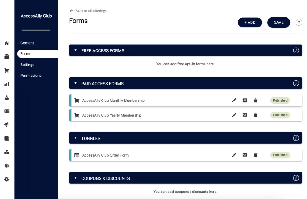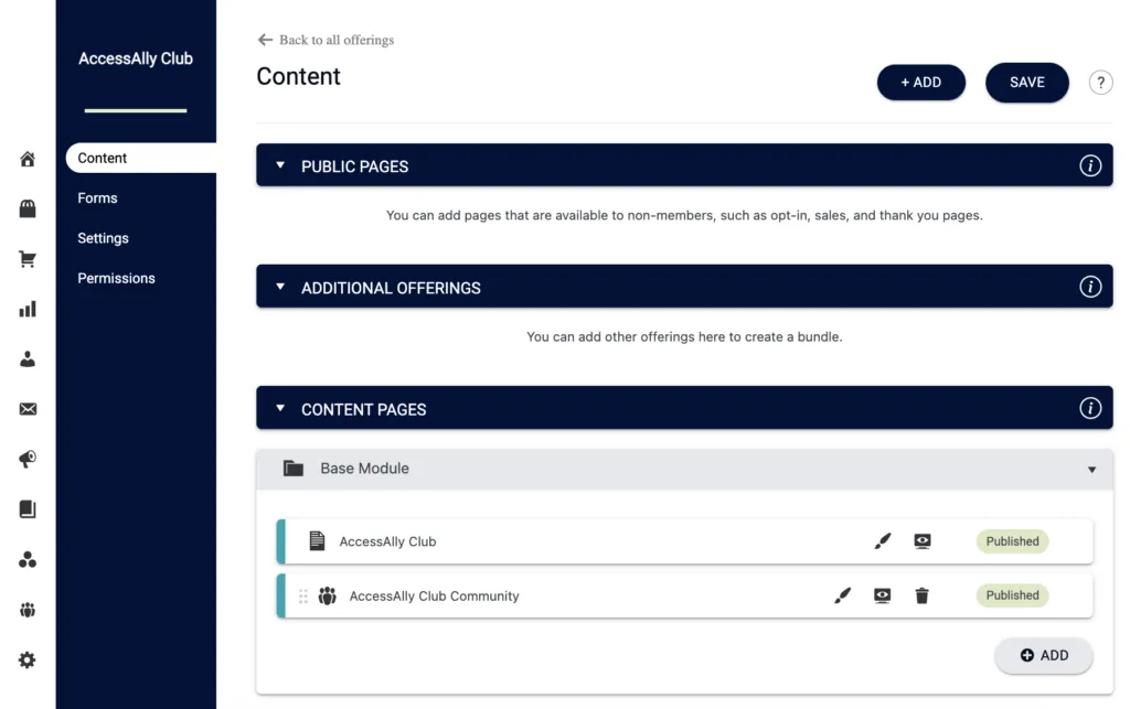 This offering contains the order forms and payment plans for your membership. You can set this up with a single base module welcome page & add a community group (if desired.)