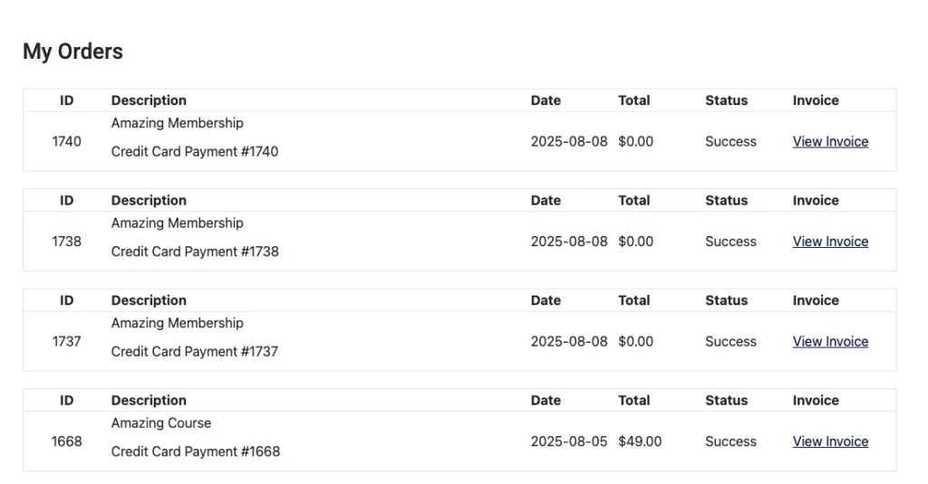 In this section of the page orders show as they are placed by your members. The orders shown here, use the Order ID number which admins view from AccessAlly → Sales → Orders.