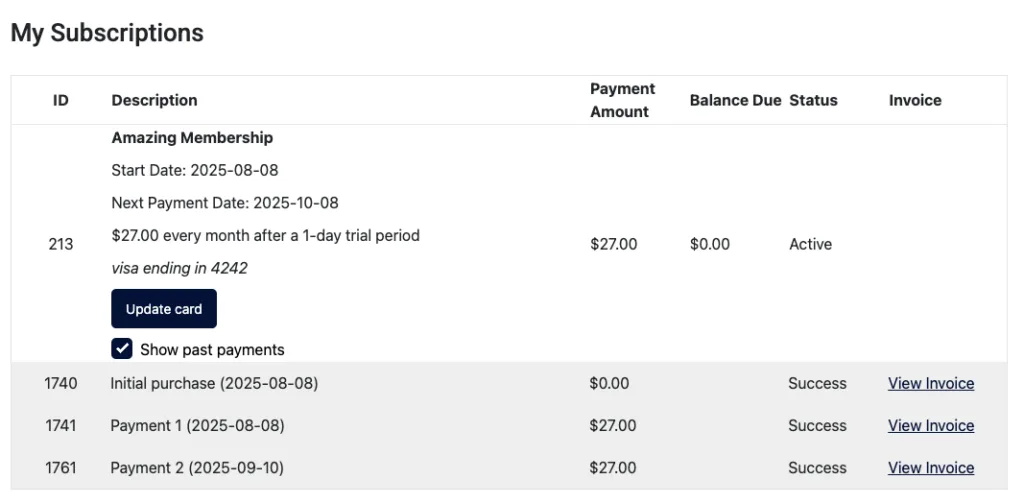 Customers will see all payment plan and recurring payments. This subscriptions shown here use the Subscription ID number which admins view from AccessAlly → Sales → Subscriptions.