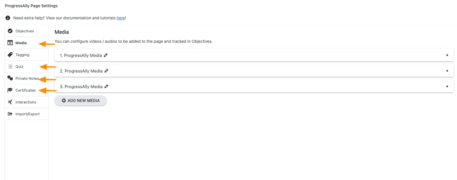 Add objectives for course activities for ALL your modules and pages (media, private notes, quizzes, etc.) that you want to be displayed in the progress tracker.
