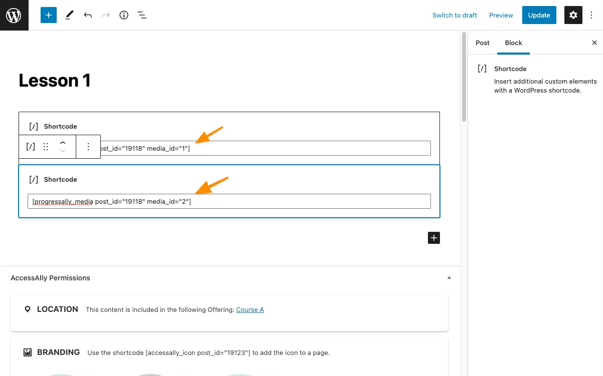 In the AccessAlly shortcode adder, which you can find in top bar in the WordPress admin area, select “Objective List” and then check off the subset of objectives that apply to each page.