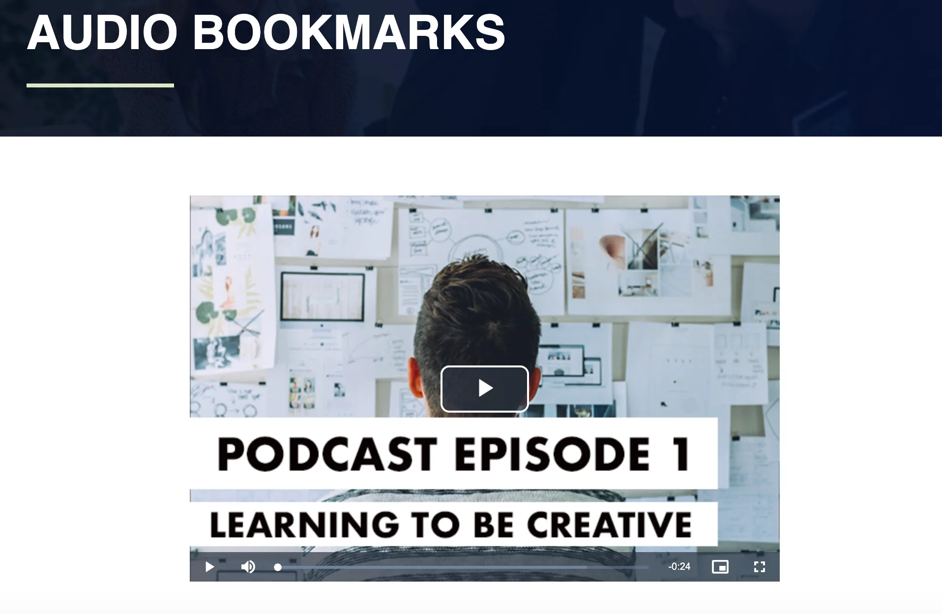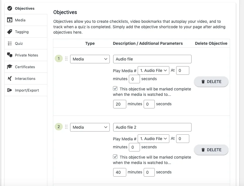 In the example below, we’ve created two objective “bookmarks” for a 40-minute audio lesson. The first starts at the beginning and is marked complete when they hit minute 20 (the halfway point).The second bookmark, if clicked on by the user, will take them to the 20 minute point instantly, so they don’t have to manually search if they take a break mid-lesson and come back to it later. This objective is also configured so that it automatically marks itself complete when they finish the audio lesson.