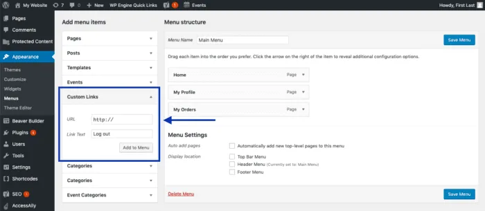 When creating your menu in WordPress, you’ll want to select the Custom Link option for the Logout item.