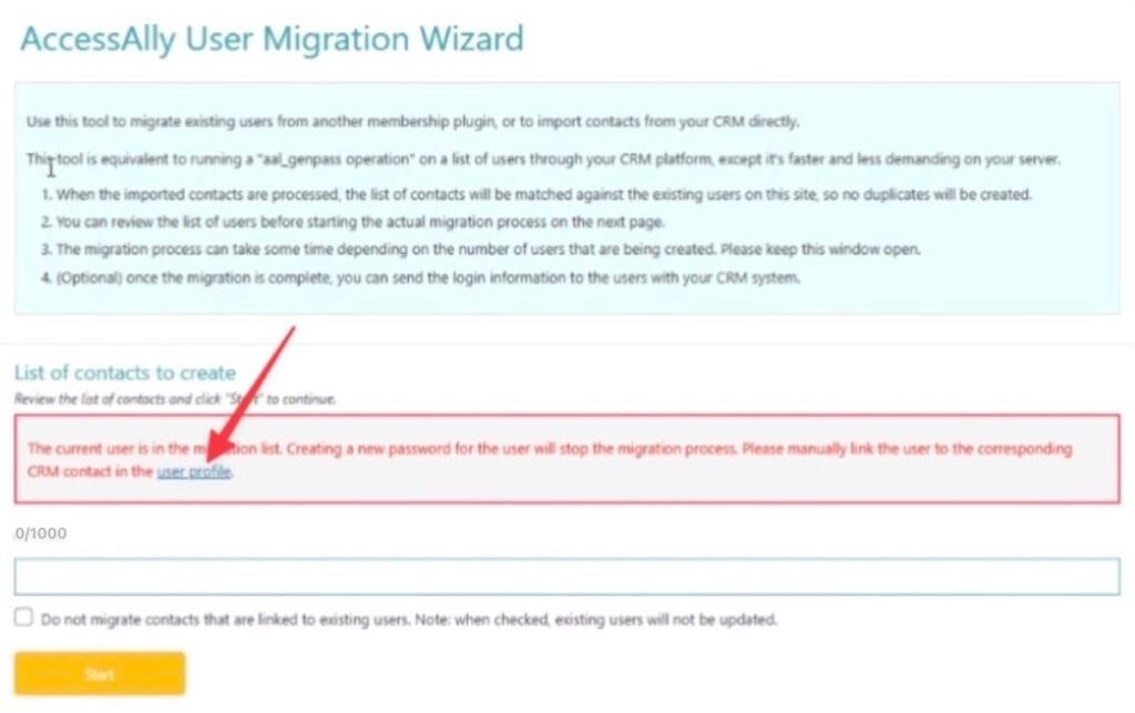 It’s a good idea to review the contact list one more time as its displayed inside AccessAlly. When you’re ready, click on the yellow “start” button to begin the migration.