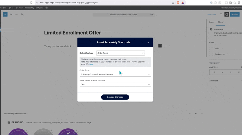 A: Yes, you can! Go to the page you’d like to add the order form with enrollment limit to, use the AccessAlly shortcode generator to get the order form shortcode.