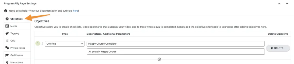 - Objective list shortcode: the code used to display Objectives on the front-end page.