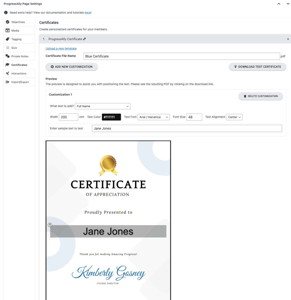 Use this tab to enable the Certificates feature. Certificates are uploaded and created within the tab, then presented on the page using the AccessAlly → Shortcode Generator → Interaction shortcode.
