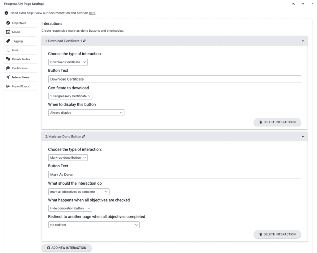 Interactions are used to create Mark-as-Done buttons, Certificate Download buttons, and for advanced displays shown after completion of Objectives. Items created here are presented on the page AccessAlly → Shortcode Generator → Interaction shortcode.