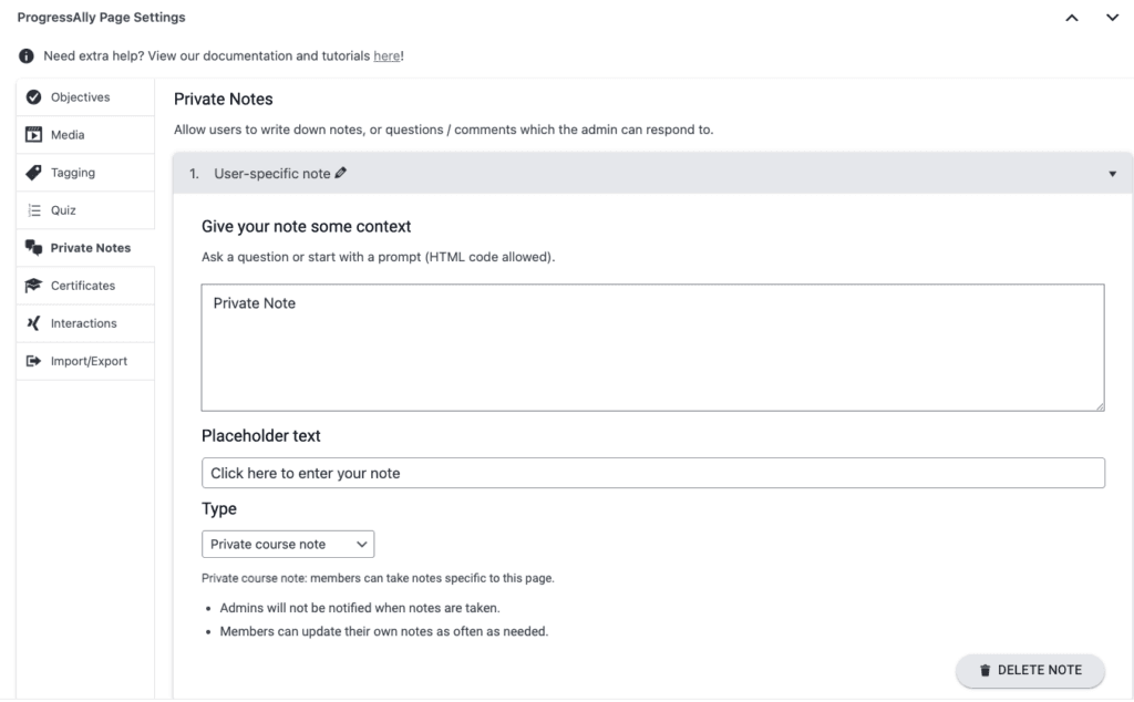 Use this tab to enable the Private Notes feature. Private Notes are created here within the tab, then presented on the page using the AccessAlly → Shortcode Generator → Private Note shortcode.
