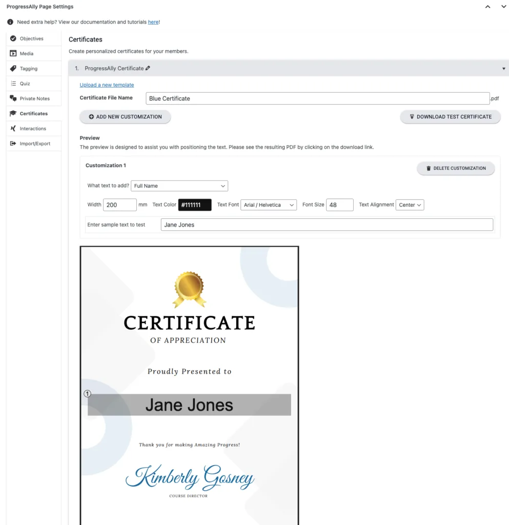 Use this tab to enable the Certificates feature. Certificates are uploaded and created within the tab, then presented on the page using the AccessAlly → Shortcode Generator → Interaction shortcode.