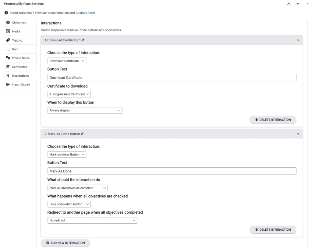Interactions are used to create Mark-as-Done buttons, Certificate Download buttons, and for advanced displays shown after completion of Objectives. Items created here are presented on the page AccessAlly → Shortcode Generator → Interaction shortcode.