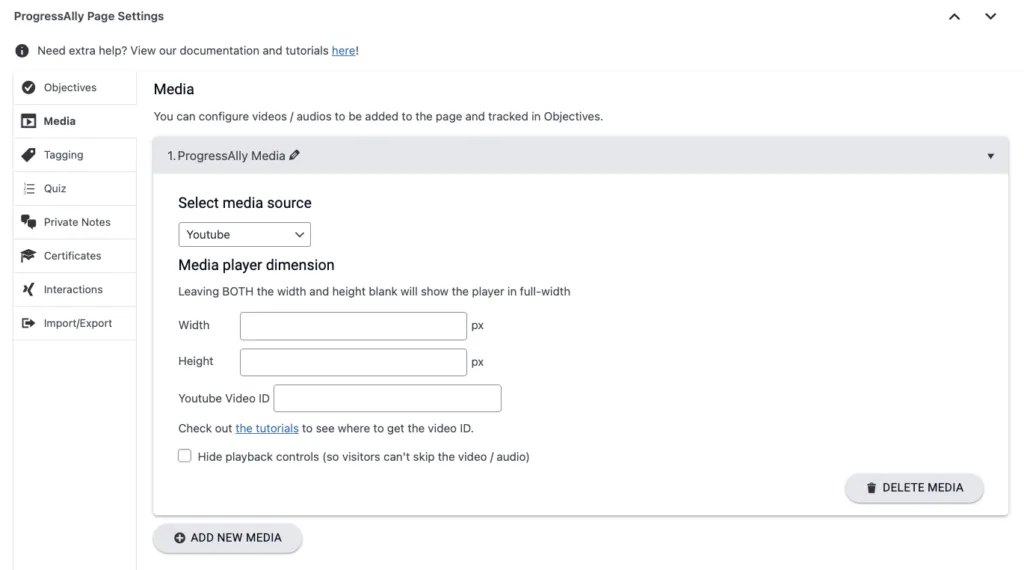 The media tab is used to add video & audio content for use on pages/posts in your site. Each “media” file is added, in the tab – then presented on the page; using the AccessAlly → Shortcode Generator → Media Player shortcode.