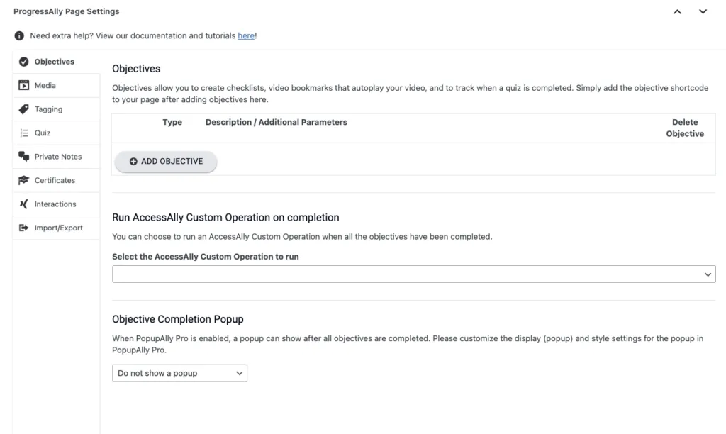 Objectives are added in the tab – then presented on the page; using the AccessAlly → Shortcode Generator → Objective List shortcode.