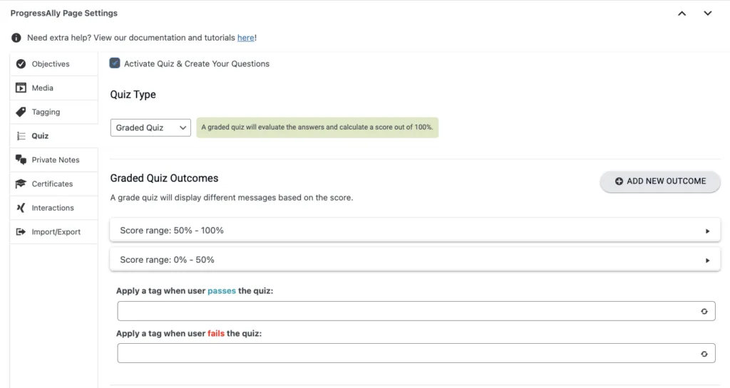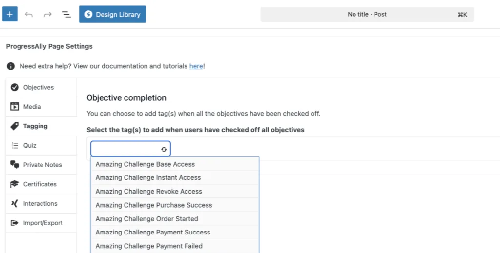 The tagging tab, is used to apply tags, when all objectives are marked complete. Tags are most often used to trigger emails for CRM integrated sites, or to unlock pages/posts giving a learner access to those items.