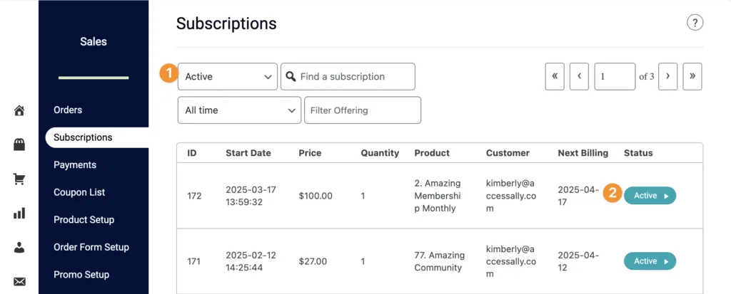 In the Subscription Management area, you have the option to pause a subscription on AccessAlly.