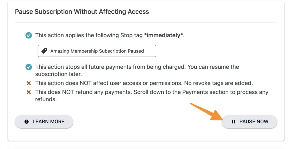 The most common use case for this option is to “pause a subscription” for a period of time, without removing access to offering content for the client. This might be done because you want to extend the time someone has on a membership, or to give people extra free time. (You can also skip payments to achieve this, but in some cases like a yearly subscription a pause and resume is a better solution.)